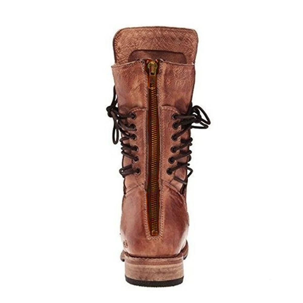 Special Offer Women Leather Mid Calf Boots Retro Punk Lace Up Low Heels Autumn Winter Motorcycle Boots Vintage Round Toe Cowboy Western Boots Discount 51% Today!