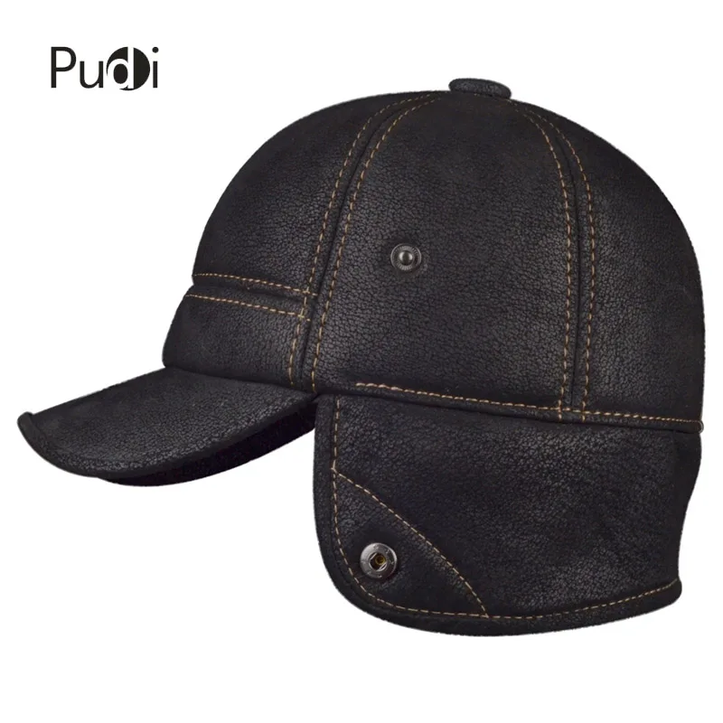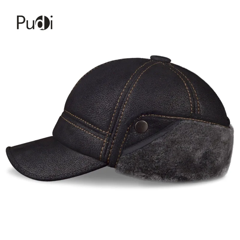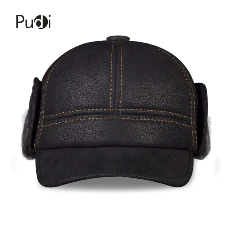 Special Offer Pudi Men s Scrub Genuine Leather baseball caps hats Faux fur Winter Warm ear flap Hat Cap black brown camel HL083 Discount 40% Today!