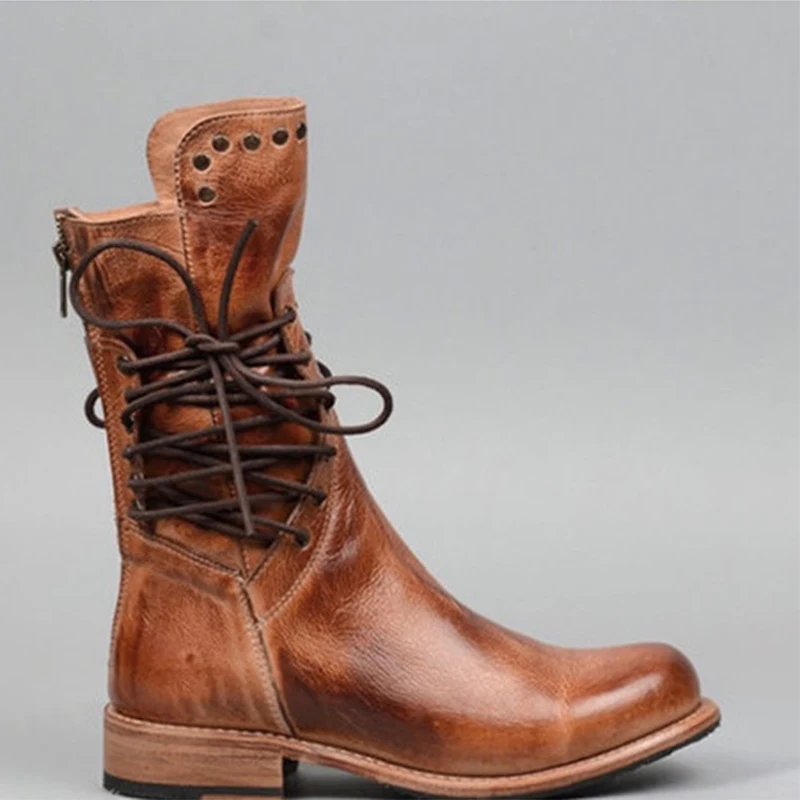 Special Offer 2019 New Winter Boots Women Retro Shoes Leather Boots Vintage Rivets Round Toe Lace Up mid calf Martin Boots zapatos Plus Size Discount 40% Today!