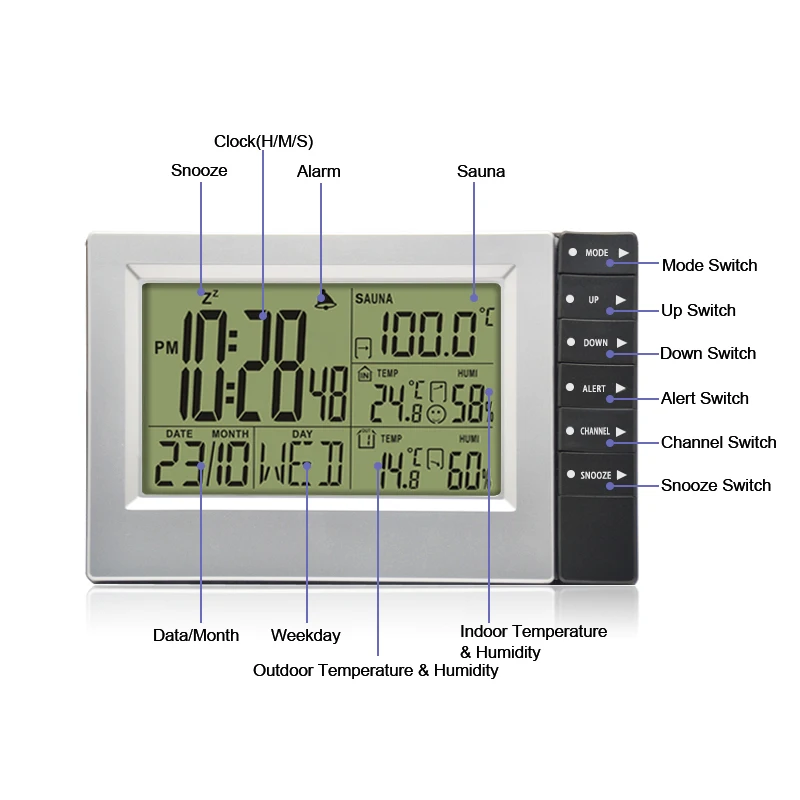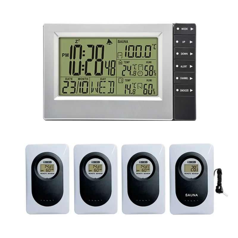 Special Offer Wireless Weather Station Digital Display Alarm Clock Sauna Temperature Indoor Outdoor Thermometer Hygrometer most up 4 Sensors Discount 40% Today!