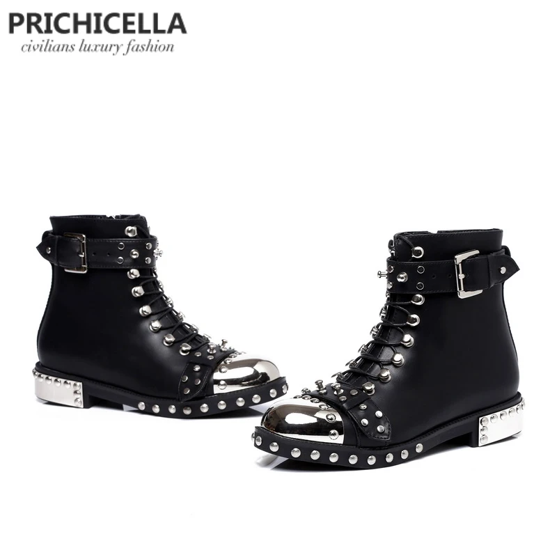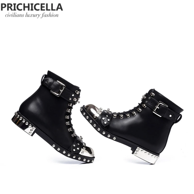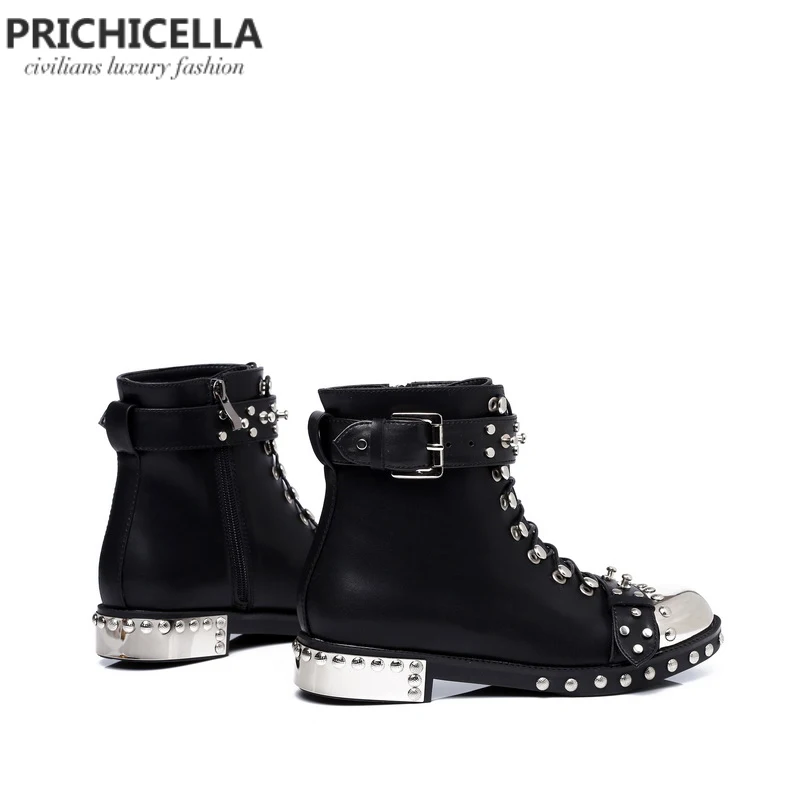Special Offer PRICHICELLA quality black flats genuine leather studded lace up ankle boots,motorcycle winter booties Discount 0% Today!