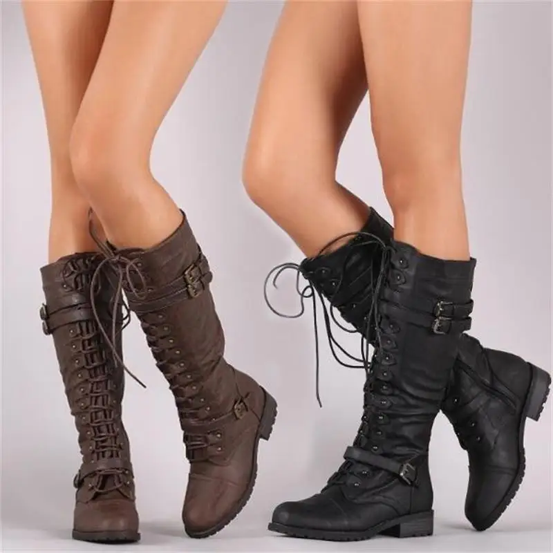 Best . (40% Off) Buy Knee High Women Boots Autumn woman shoes Winter Lace Up Vintage Flat Shoes Sexy Steampunk Leather Retro Buckle Ladies Snow Boots Cheap Online.